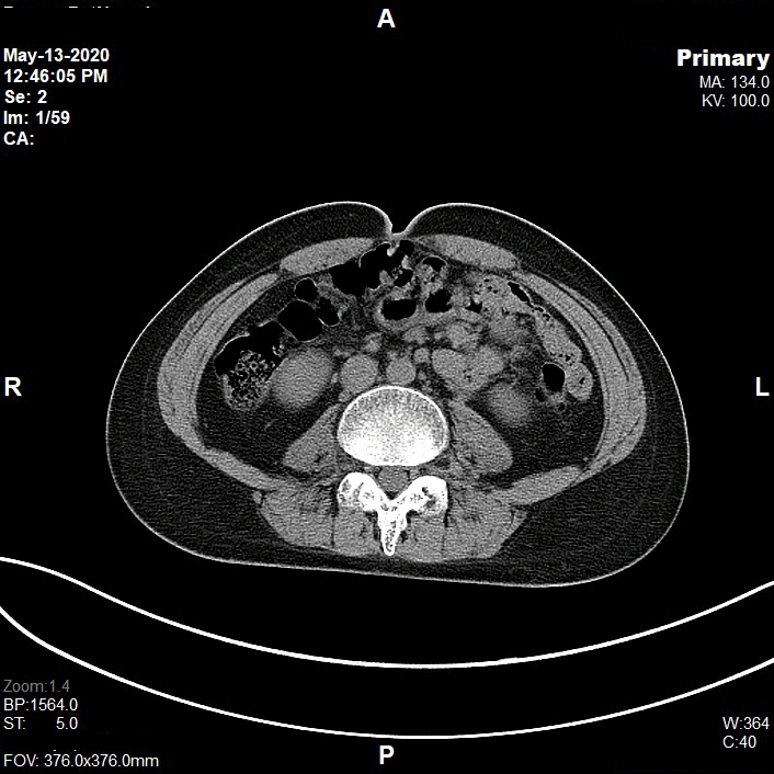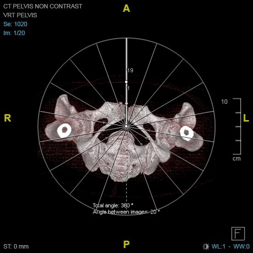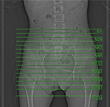 - Stop the topogram scanning when the scanning reach / pass over the inferior pubis ramus / lesser trochanter.