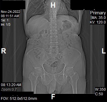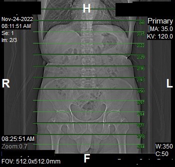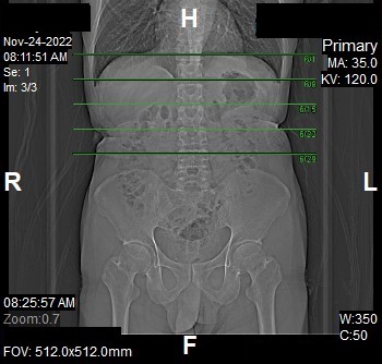 - Stop the topogram scanning when the scanning reach / pass over the inferior ischial ramus.